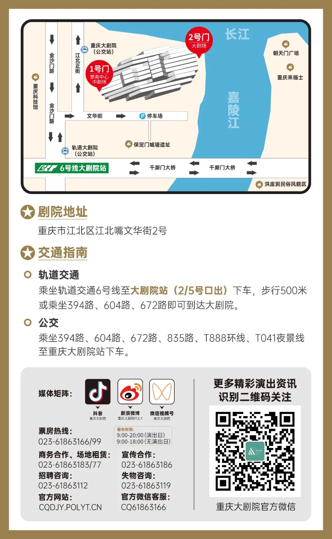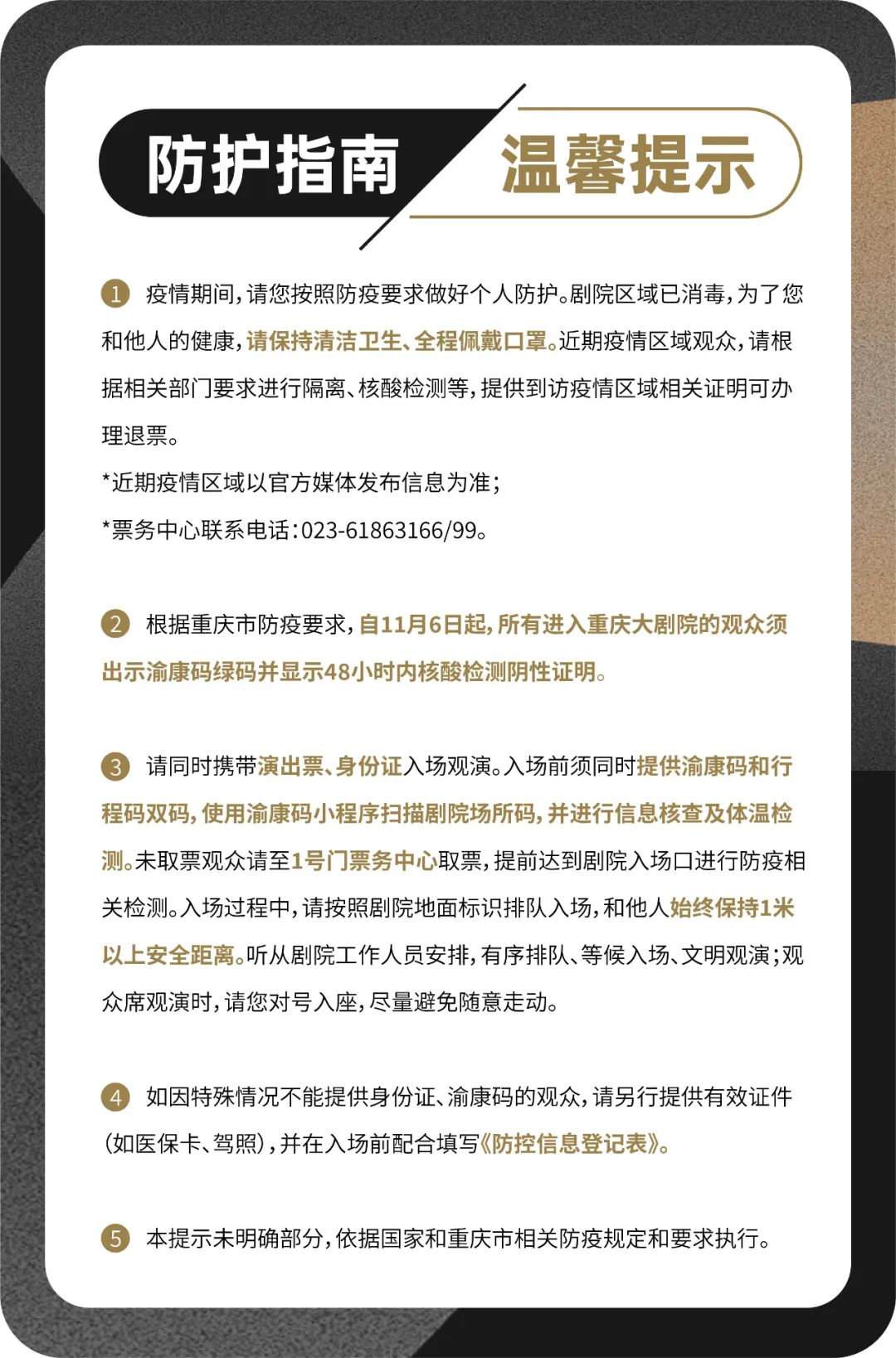 为了感谢每一位购票观众特殊时期一如既往的支持,我们已经推出「重返剧场·回馈计划」——凡是通过剧院官方渠道购买过以上演出的观众,都将免费获得对应数量的后期其他剧目演出票。回馈计划详细规则请咨询重庆大剧院票务中心:(座机)023-61863166/99 或(手机)18716497577、18716498578。