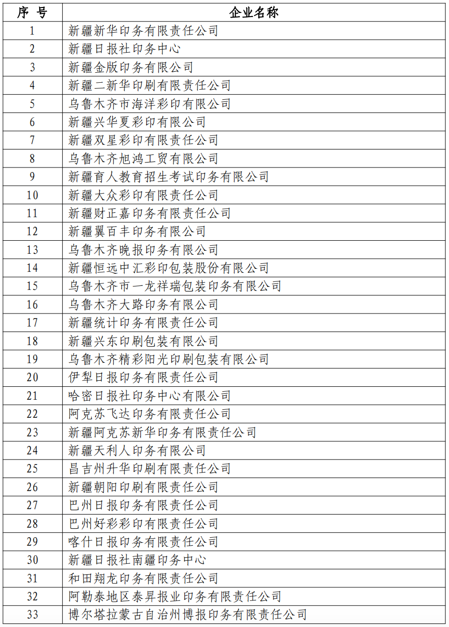 适用增值税100%先征后退政策的新疆维吾尔自治区印刷企业名单