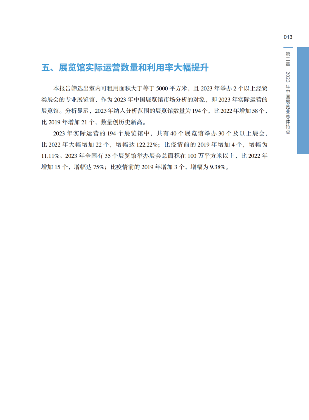 展览馆实际运营数量和利用率大幅提升。2023年实际运营的展览馆数量为194个,数量创历年新高。2023年各地加快展览馆建设步伐,新建展览馆迎来交付高潮,据不完全统计,2023年新增展览馆可展览面积超过100万平方米。