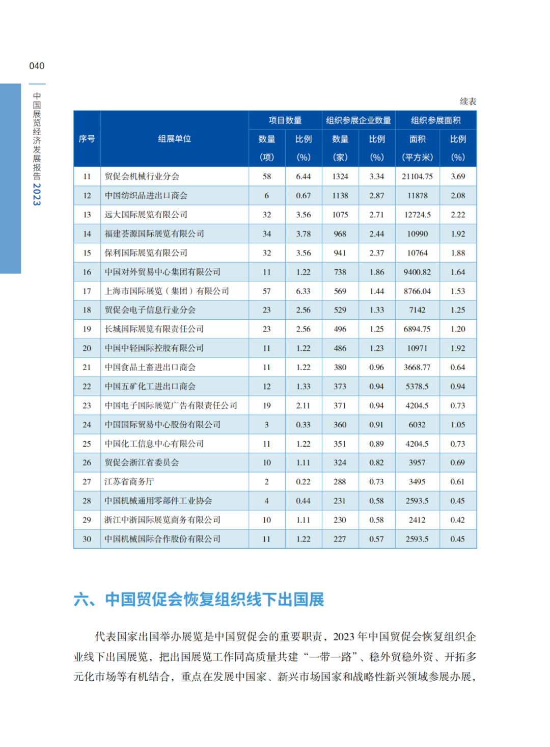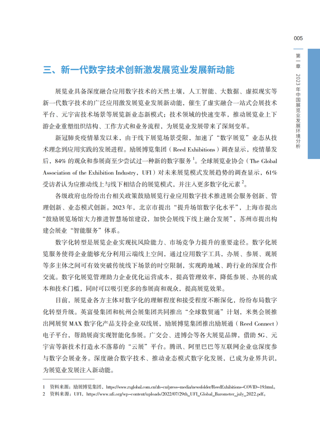 中国贸促会展览管理部部长邬胜荣介绍,2023年,中国展览业发展呈现五大特征:中国经贸类展会全面恢复至疫情前水平;展览业经营主体经营情况不断恢复向好;企业重启出国参办展,加大市场开拓力度;国家级展会成为引领展览业复苏排头兵;展览馆实际运营数量和利用率大幅提升。