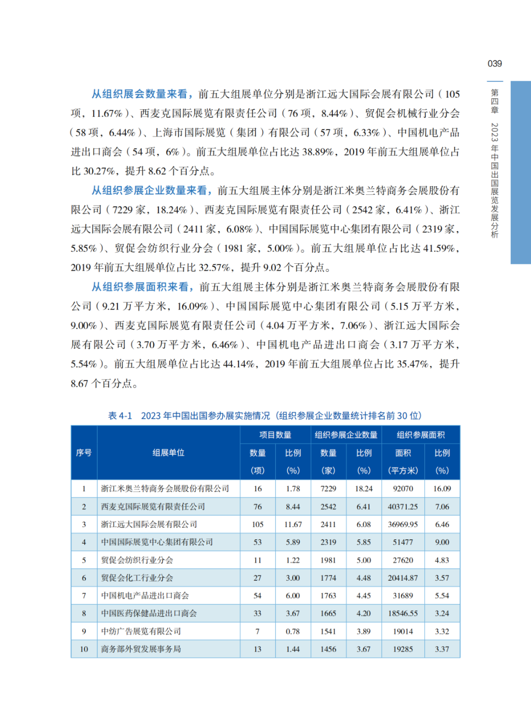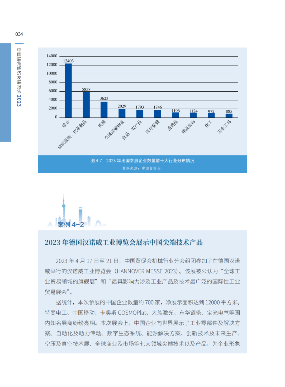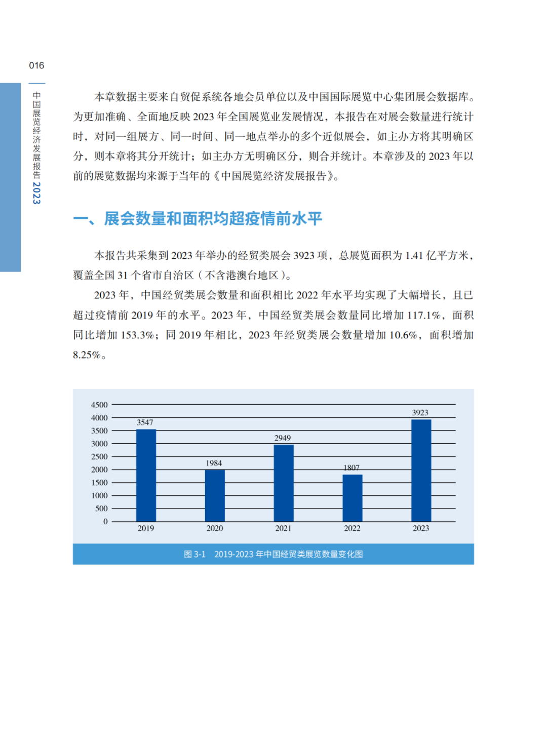 2023年中国共举办经贸类展会3923场,较2022年增长117.1%,较2019年增长10.6%;办展总面积1.41亿平方米,较2022年增长153.3%,较2019年增长8.25%。