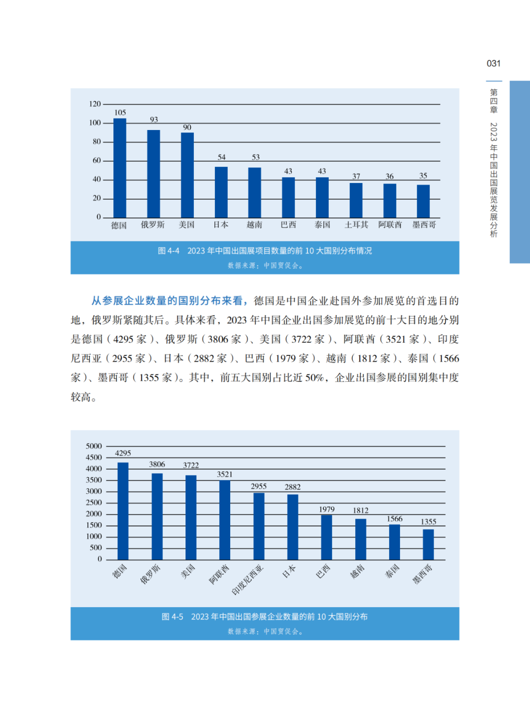 随着国际交往的逐渐恢复、经济形势不断复苏向好,中国国内企业纷纷重启出国参展办展,加大力度开拓国外市场。数据显示,2023年中国贸促会审批通过并实际执行出国展览项目900项,涉及55个国家或地区,展览面积57.22万平方米,参展企业共计3.96万家。其中,出国办展78项,占出国展览项目总数的8.7%。出国办展项目质量有所提升,2023年出国办展各项平均数据达到甚至超过2019年水平。