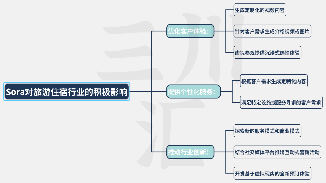 与短视频、影视、动漫、游戏等领域应用相比,Sora的视频生成和图片生成功能虽然在旅游住宿行业中应用较少,但对这个行业同样也带来了诸多积极影响。其中,包括提升营销效果、优化客户体验、提供个性化服务以及推动行业创新,这些功能的应用将有助于旅游住宿行业在竞争激烈的市场竞争中脱颖而出。